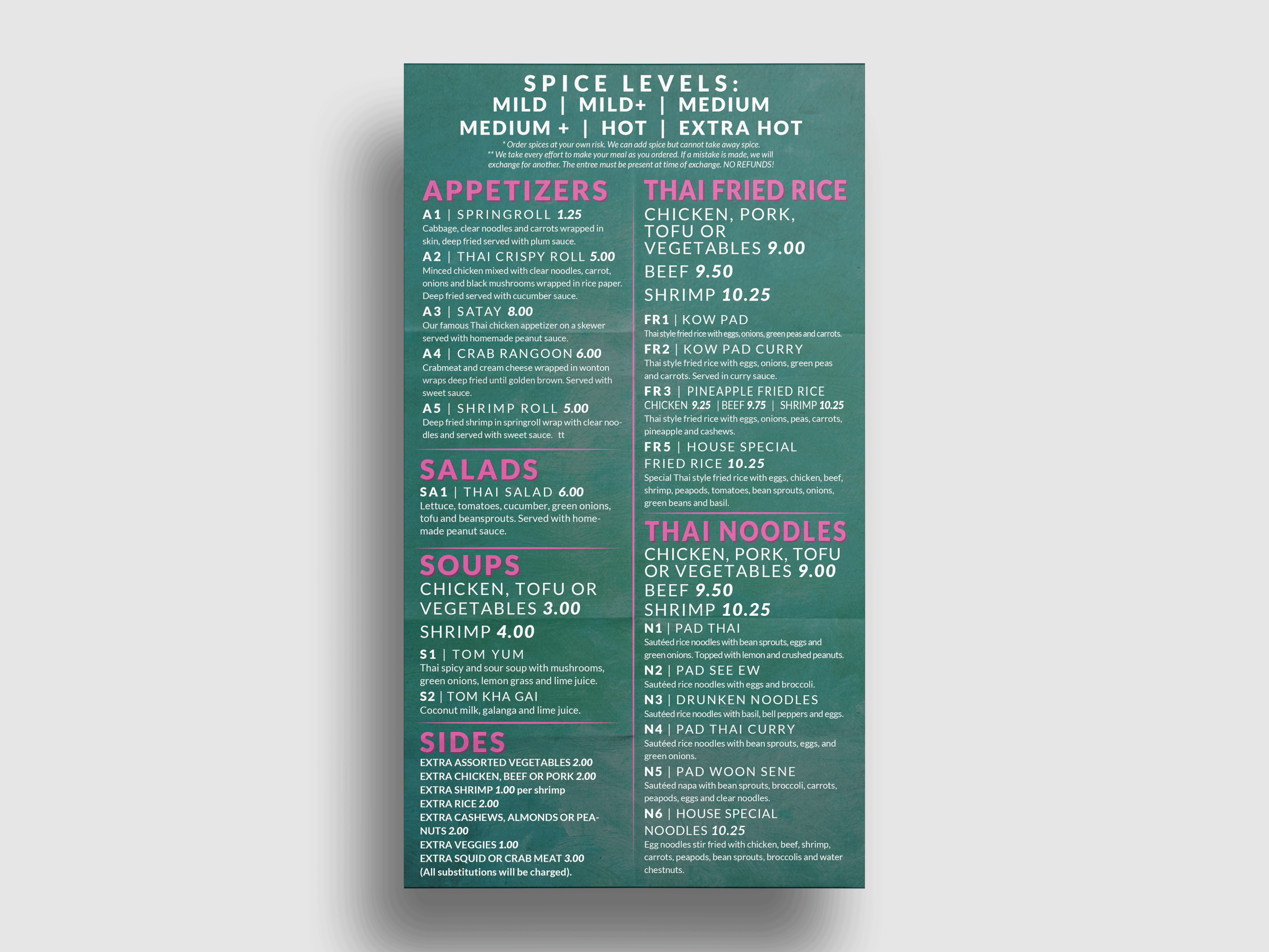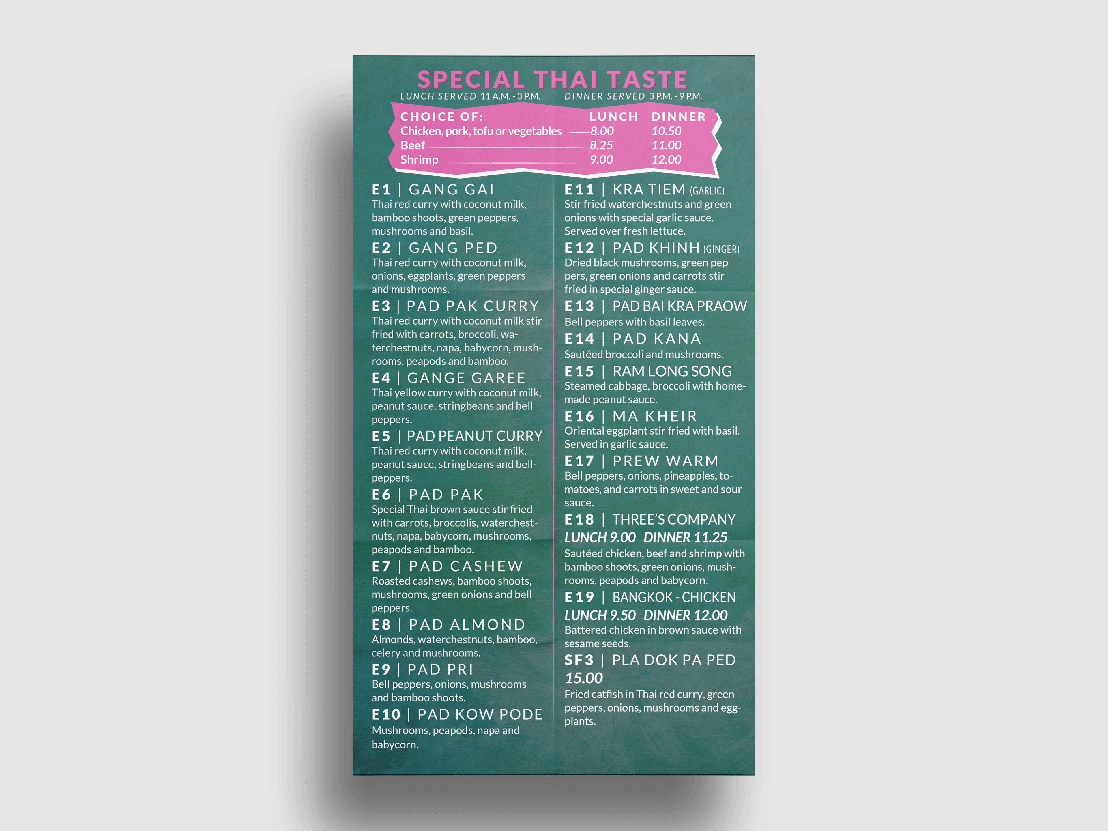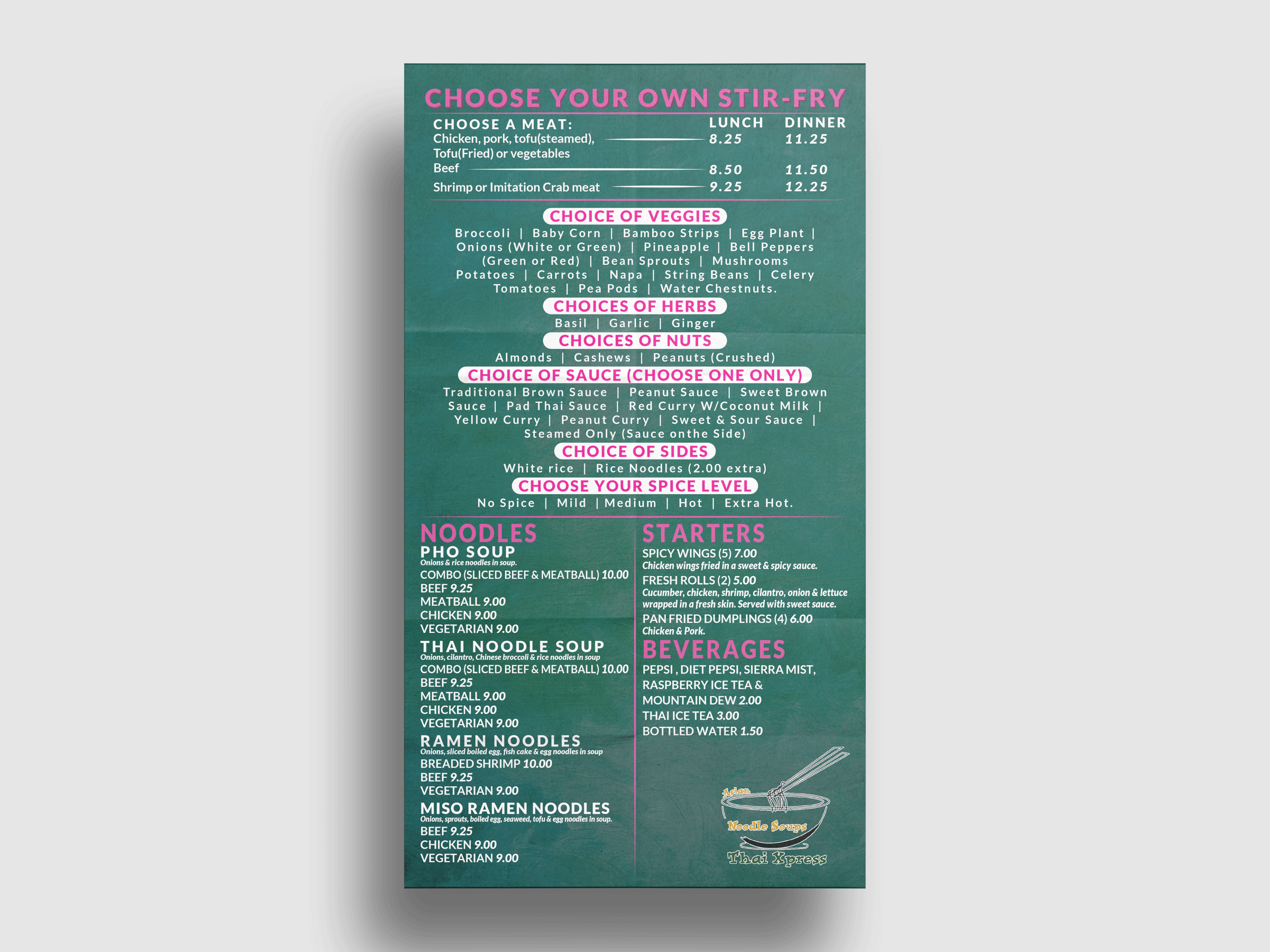 Animated food graphic digital menu for Thai Express restaurant in Michigan. Includes static vertical digital menus